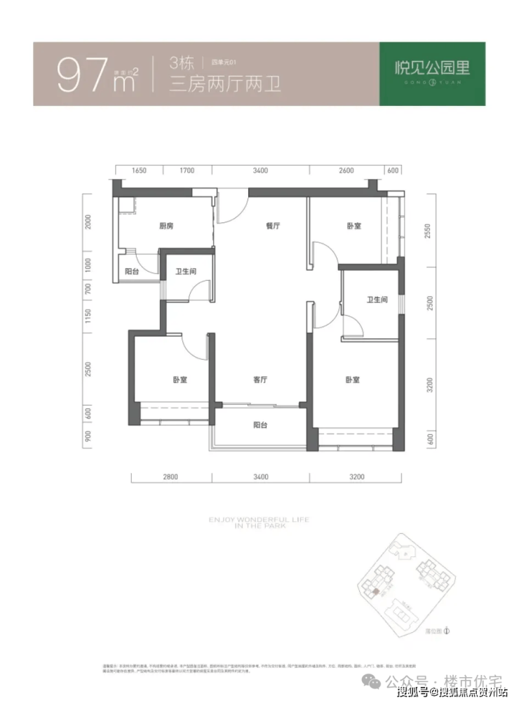 97㎡的3房2厅2卫,仅3栋4单元01户型,设计的是竖厅双龙抱珠格局,客厅3.4米开间,三开间朝南,3个卧室分别做到了主卧11.97㎡/次卧7.47㎡/次卧7.17㎡(实测面积,去掉墙体),L型厨房带1个生活阳台,公卫三段式分离,得房率73.61%(不含赠送),东南朝向。