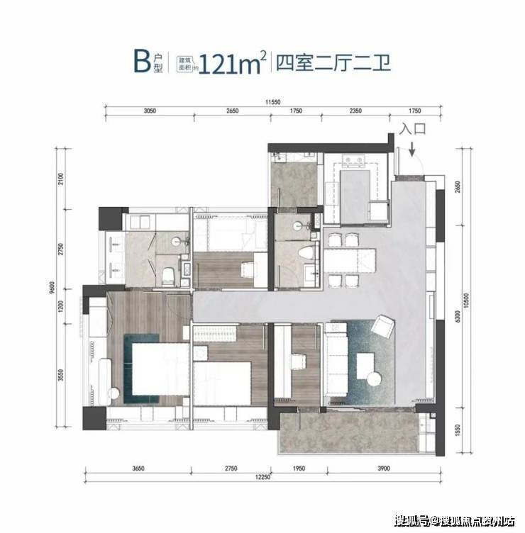 B户型 建筑面积约121㎡/121㎡ 4房2厅2卫 东南朝向,大开间短进深,通风采光性能良好开阔四房,竖厅与阳台相连,一进门就让人眼前一亮;餐厅、厨房、客厅、阳台一体化设计,功能灵活多变。客餐厅可直接通往阳台,业主可以在这里锻炼和娱乐,阳台还能作为生活空间的延伸。动静分区,每个房间都很开阔,居住舒适性高。主卧双飘窗设计,可双面采光,通透明亮,空间感更强;尤为贴心的是,主卧自带的洗手间采用了双台盆设计,让洗漱时光更为从容