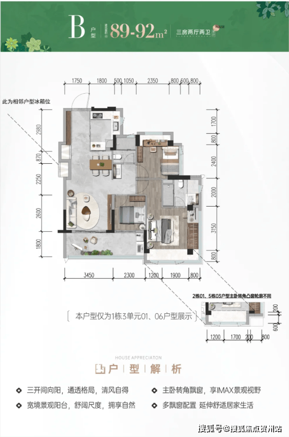 (2)89-92㎡三房两卫:分竖厅和横厅,全凸窗设计,竖厅可观会展河景;