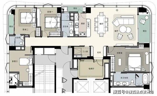 (2)307㎡户型:4+1房3厅5卫,三阳台(亲海阳台总面宽超12米),含约50㎡南向海景套房,家庭灵动空间可作影视厅。