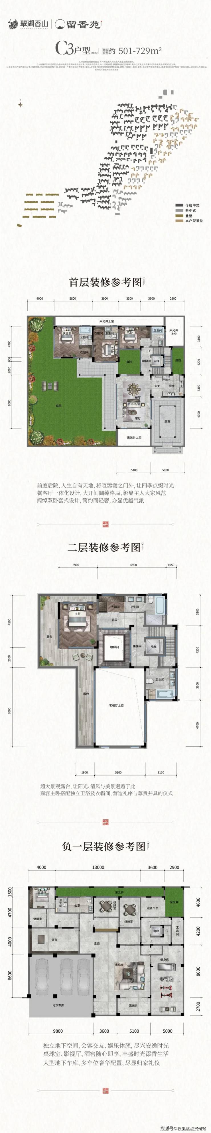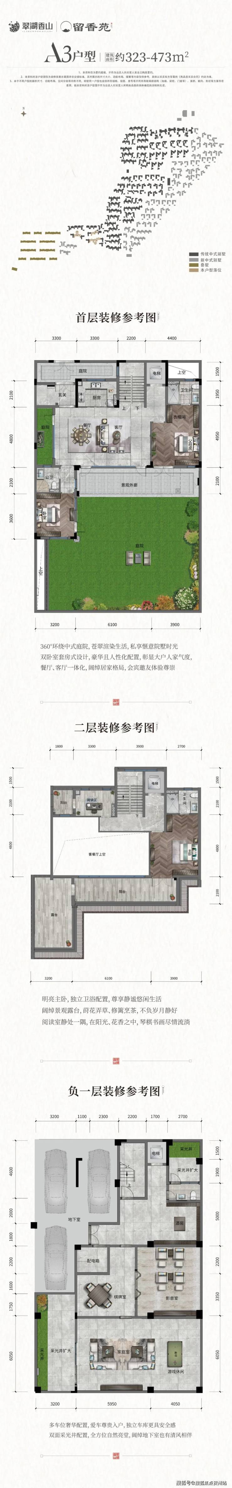 性价比极高,北入口,入户庭院设计,彰显豪门气派,入户客厅6米6挑空,主花园合计137平,方正实用,合院少有的三步富贵入门,地下室方正柱子少