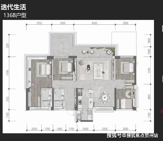 约136㎡四房:约16米南向四开间,约70㎡LDKGB无界厅境,主卧套房面积接近30㎡