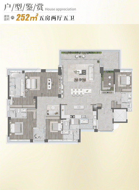 约252㎡五房:一梯一户专属格局,内外双玄关设计,约100㎡LDKGB厅区,约30㎡空中墅院,五星级酒店主卧套房尺度达50㎡