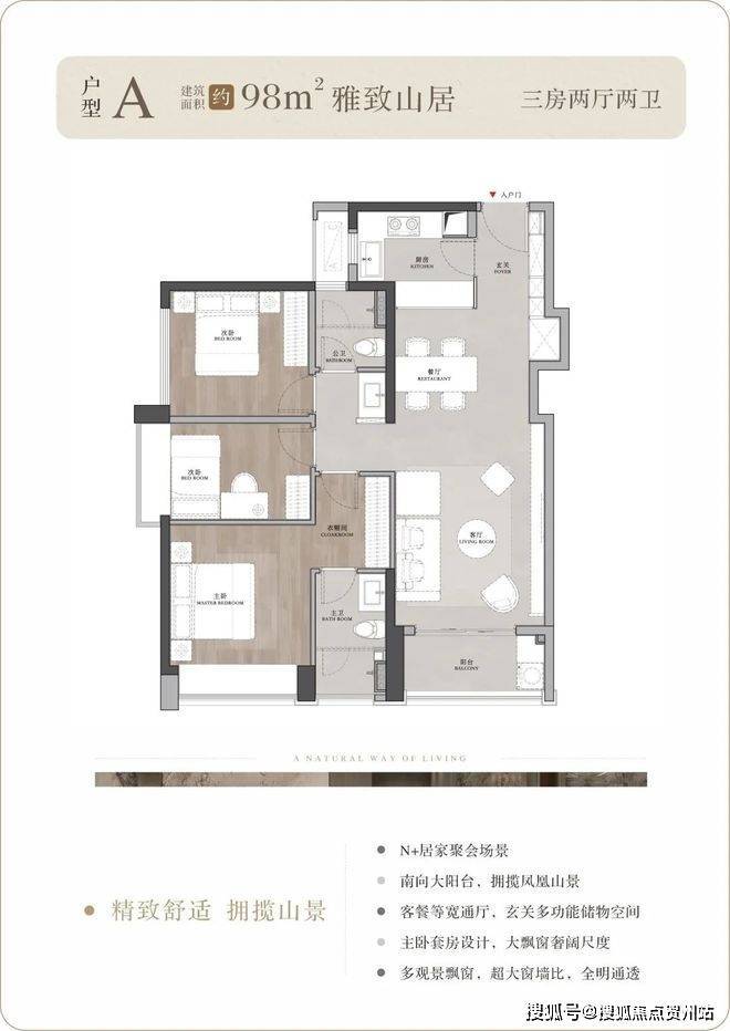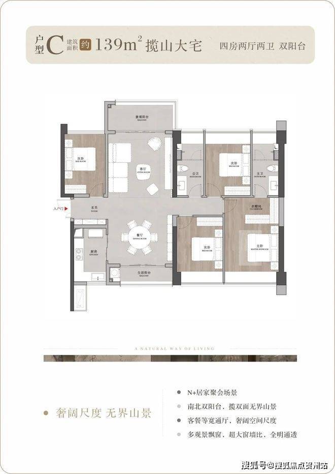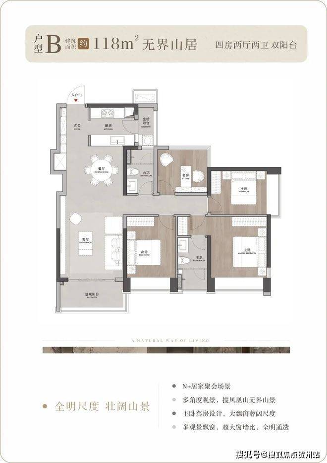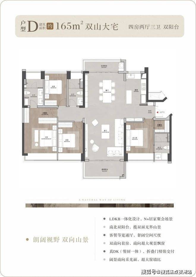 户型背山面海,超大的窗墙比将窗外无价的山海资源揽入户内,所有户型都可以看到开阔的山景,部分户型高楼层可以同时看到山海景观;南向大面宽、小进深,结合现代人家居理念的LDKB一体化设计,打造城市之芯的巨幕山海。