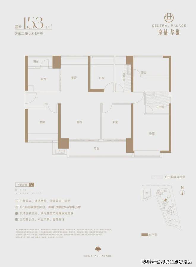 项目户型包括95㎡的3房2厅2卫、99㎡的3房2厅2卫、111㎡的3房2厅2卫、120㎡的3房2厅2卫、143㎡的4房2厅2卫及153㎡的5房2厅2卫,143㎡四房为横厅设计。