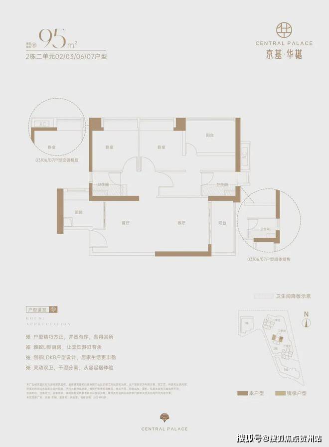 仅2栋2单元05户型才有,设计的是经典竖厅格局,LDKB一体化,动静分区,四开间朝南,U型厨房,卫生间干湿分离,得房率约73%(不含赠送),阳台西南朝向。