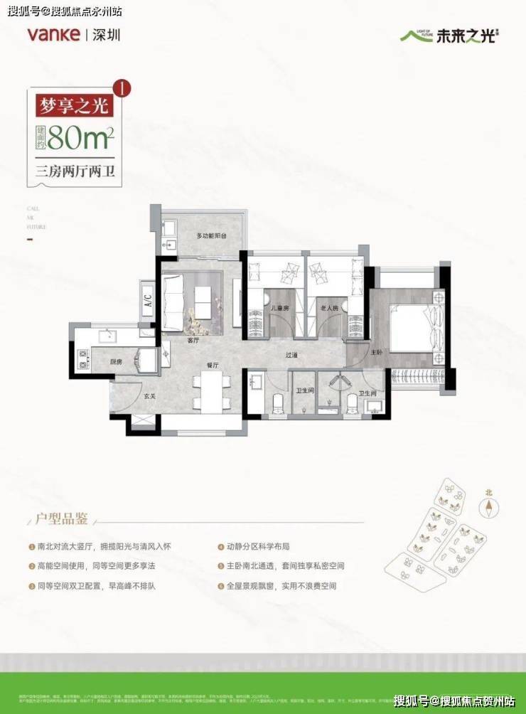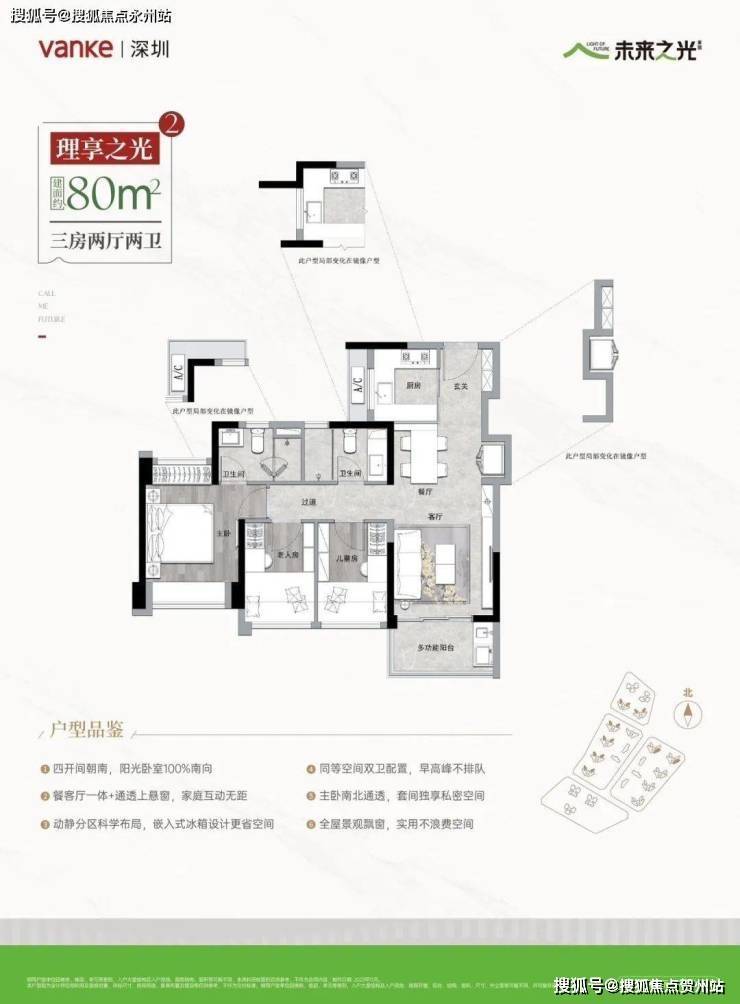 · 80㎡ 3 房 2 卫:南北通 / 东南向,双卫设计,总价约 600 万起(实用率约 80.7%,分横 / 竖厅)。