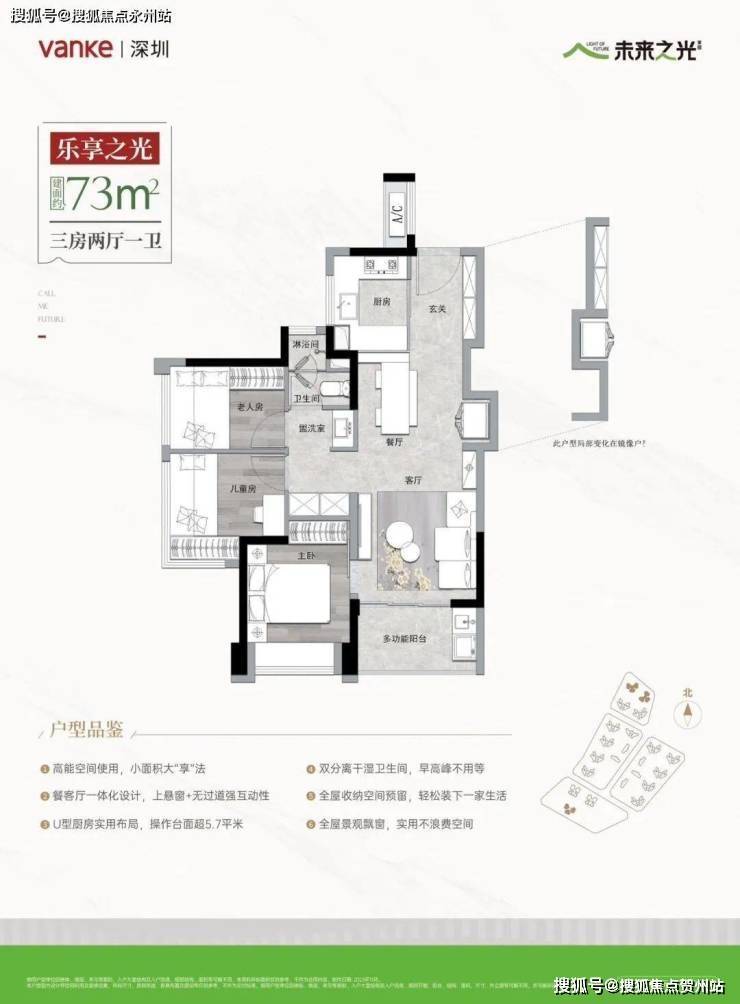 · 73㎡ 3 房 1 卫:竖厅设计,LDKG 一体化,三段式卫生间,总价约 547 万起(实用率约 79.6%)。