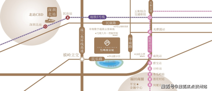 项目直线距离10号线南坑站约600米,周边还有10号线光雅园站、5号线民治站,6号线白石龙站,及规划中的22号线,地铁通勤便利。周边道路有珠三角环线高速、五和大道、民乐路等,可快速到达深圳福田等各核心区域。