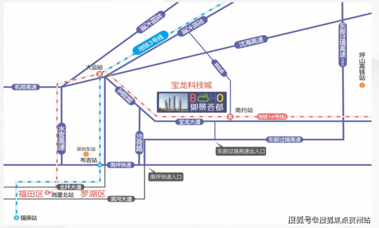 项目直连地铁 14 号线 南约地铁口(规划中 31 号、23 号线),2 站大运、9 站福田中心,未来可享四地铁交汇利好;沈海高速和东部过境高速南北贯穿直通罗湖,无缝连接福田、南山;坐享地铁、铁路交通、公交枢纽等多维交通体系,快速通达深圳中心城区、香港及周边城市,高效链接都会生活圈。