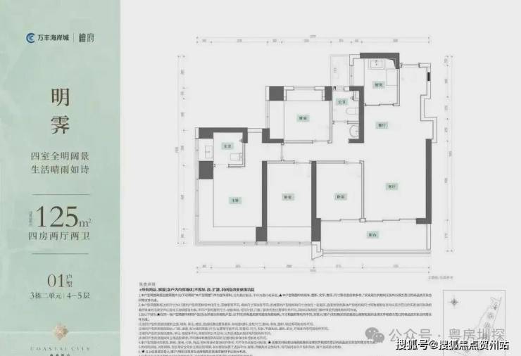 125㎡的4房2厅2卫,设计的是经典竖厅格局,客厅3.75米开间,LDKB一体化,S墙设计预留冰箱卡槽位,动静分区,四开间朝南,主卧270°无柱转角飘窗,U型厨房,公卫三段式干湿分离,得房率约100%(包含赠送),客厅连接次卧出6.52米长的观景大阳台约11.42m²东南朝向。赠送面积约20.41m²。
