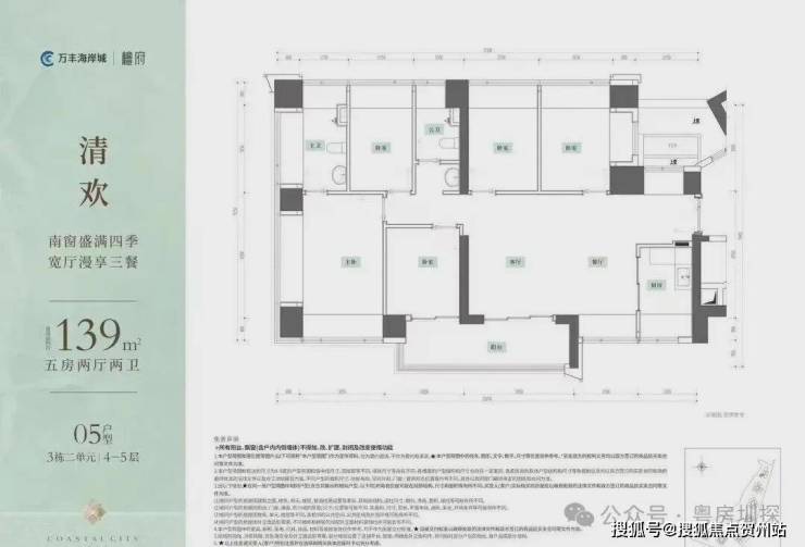 139㎡的5房2厅2卫,设计的是横厅南北通透格局,客餐厅6.25米开间,LDKB一体化,全屋12面飘窗,U型厨房,公卫三段式干湿分离,得房率约100%(包含赠送),客厅连接次卧出6.8米长的观景大阳台约11.9m²东南朝向。赠送面积约29.47m²。