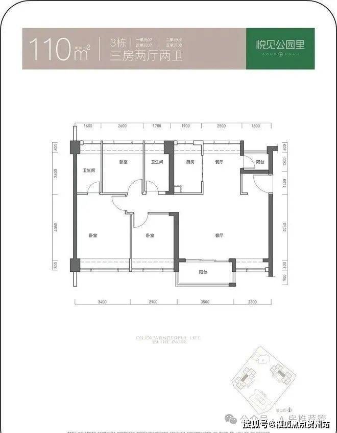 110㎡的3房2厅2卫,设计的是横厅大开间格局,客厅5.8米开间,南北通透双阳台,三开间朝南,3个卧室分别做到了3.4米/2.9米/2.6米的宽度,U型厨房,公卫三段式分离,得房率73.71%(不含赠送),阳台主朝西南或东南向。
