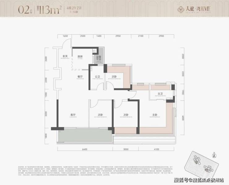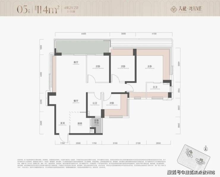 113㎡四房是项目的入门首选,采用竖厅设计,南北通透,6.4米宽大阳台连接客厅与次卧。户型动静分区明确,主卧带独立卫浴和飘窗,实际使用面积接近120㎡,空间利用率极高。