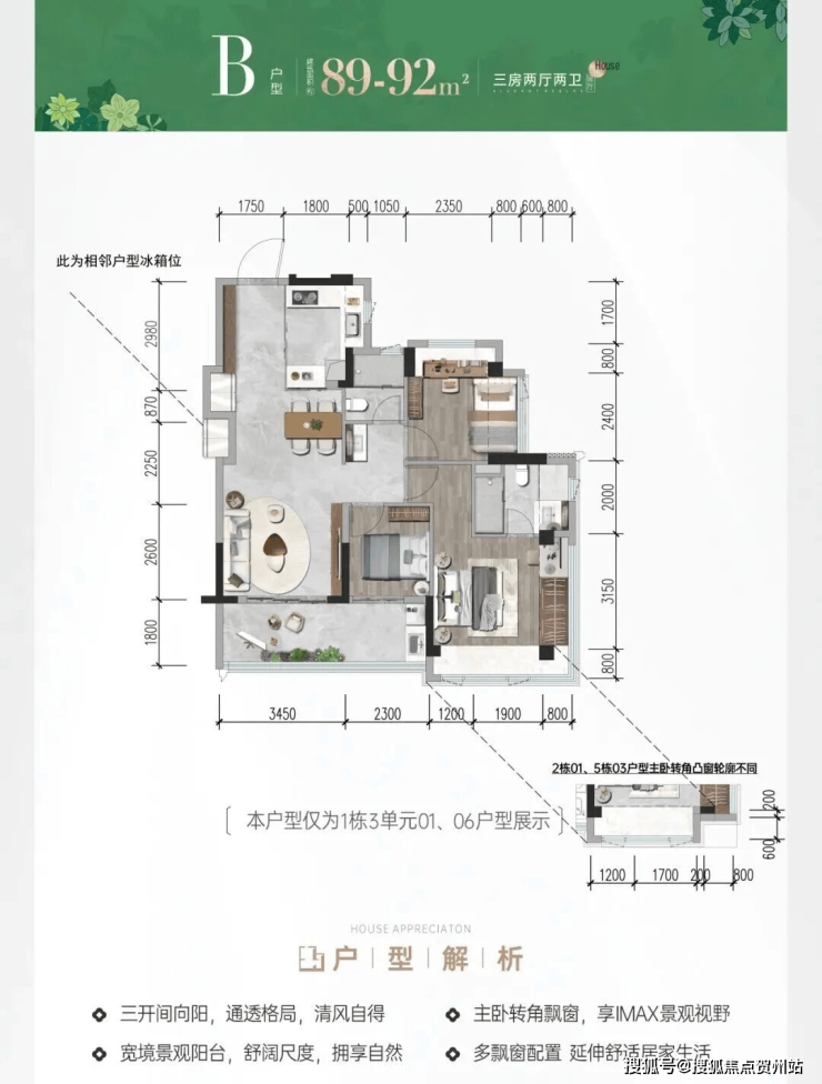 不管是78㎡的小3房还是92㎡的大3房,都是做的新规宽景阳台(约9-13㎡),连接客厅和次卧。