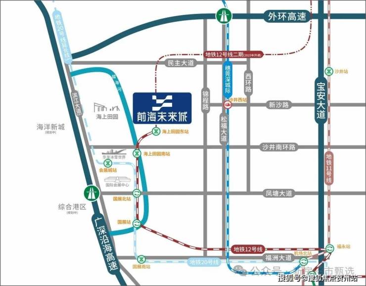 卓越前海未来城,位于宝安区沙井民主大道与德锦路交汇、地铁12号线海上田园东站边、深圳第七高级中学西侧,原为宝安沙井民主社区返还用地项目。区域定位上,项目地处大前海会展海洋城板块。
