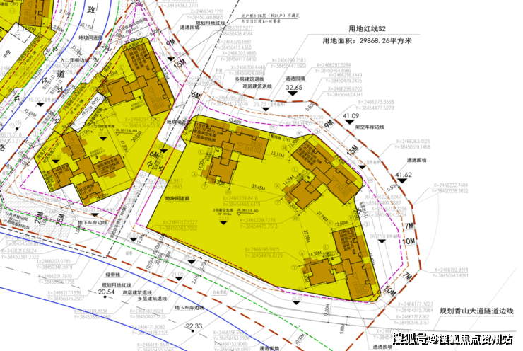 S2地块容积率2.0,建筑密度约28%,绿地率约35%,机动车位约597个。