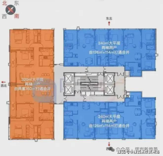 320㎡实际上是由两套160㎡原始户型合并而成,240㎡是由126㎡和114㎡打通合并而成。320㎡是两梯一户,240㎡是两梯二户。