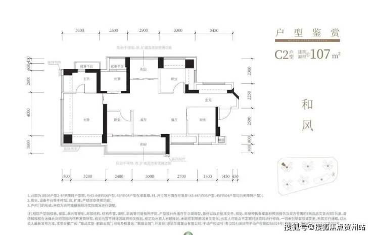107㎡的4房2厅2卫,设计的是横厅南北通透格局,进门赠送约4㎡入户玄关,客餐厅5.9米开间,4个卧室分别做到了主卧17.9㎡/次卧9.48㎡/次卧8.47㎡/次卧6.06㎡(实测面积,去掉墙体),主卧+1个次卧270°飘窗,客厅连接次卧出5.7米长大阳台,U型厨房, 得房率约102.5%(包含赠送),阳台主朝西南向。