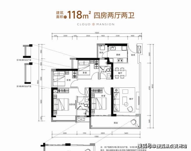 118㎡的4房2厅2卫(C1户型,1栋2单元/3单元03户型),设计的是经典竖厅格局,进门独立玄关,客厅3.5米开间,LDKB一体化设计,动静分区,四开间朝南,4个卧室分别做到了3.2米/2.8米/2.55米/2.35米的宽度,客厅连接次卧出6.4米长的大阳台,二字型厨房带1个小生活阳台,得房率75-77%(不含赠送),阳台都是朝南向。