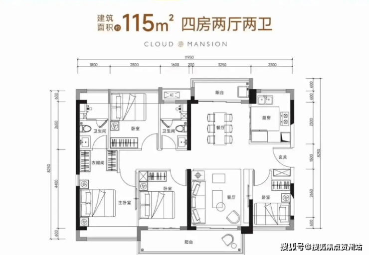 115㎡的4房2厅2卫(C3户型,仅1栋3单元01户型),设计的是竖厅南北通透格局,客厅3.45米开间,四开间朝南,双阳台设计,4个卧室分别做到了3.4米/2.8米/2.8米/2.3米的宽度,主卧大套房设计,客厅连接次卧出5.8米长的大阳台,U型厨房,得房率75-77%(不含赠送),大阳台主朝西南朝向。