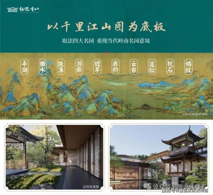 园林设计以《千里江山图》为灵感蓝本,巧妙融合岭南四大名园精髓,复刻佛山梁园"半边亭"。通过"漫卷云章"、"金水澜庭"、"琉璃水院"三进式景观轴线,呈现移步换景的东方美学。