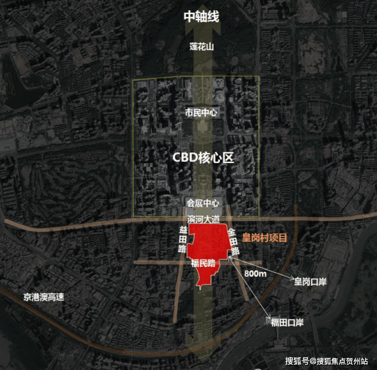 皇岗村第一期旧改项目「皇熙悦府」位于福田CBD中轴线上,滨河大道南侧。整个项目为综合体,包括住宅、商业及服务配套。