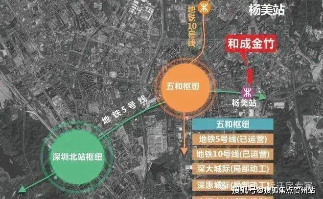 项目距离5号线杨美站约200米,2站到五和枢纽站可换乘10号线/深大城际,4站到布吉枢纽站可换乘3/14号线,4站到深圳北站可换乘4/6号线,还有高铁线路。