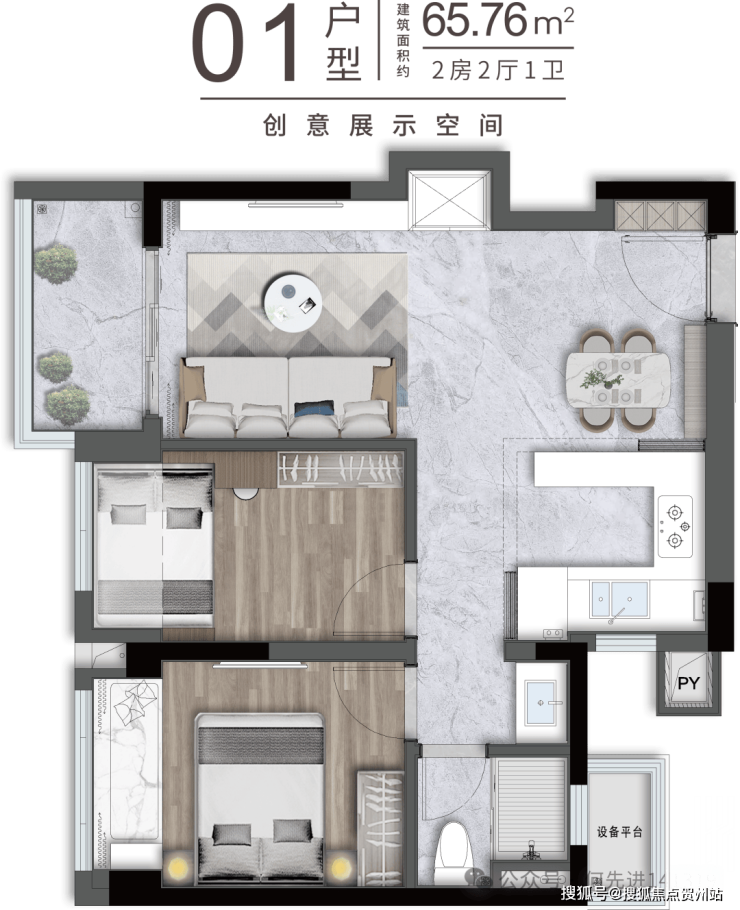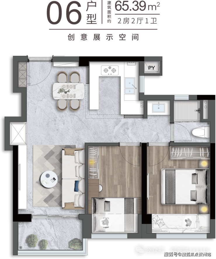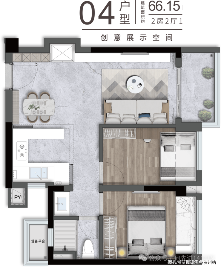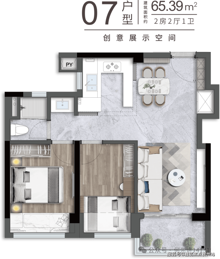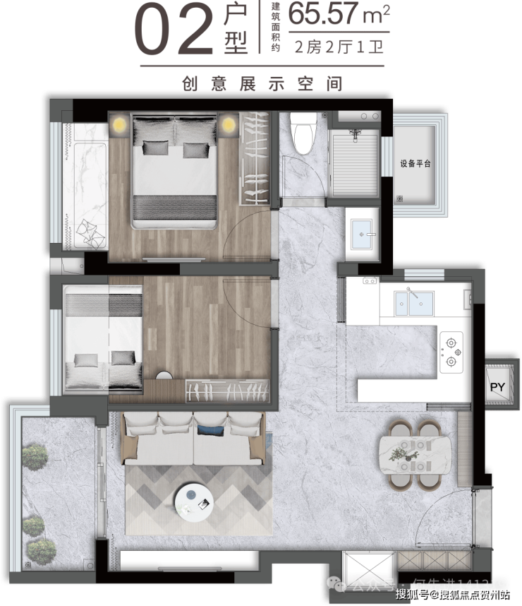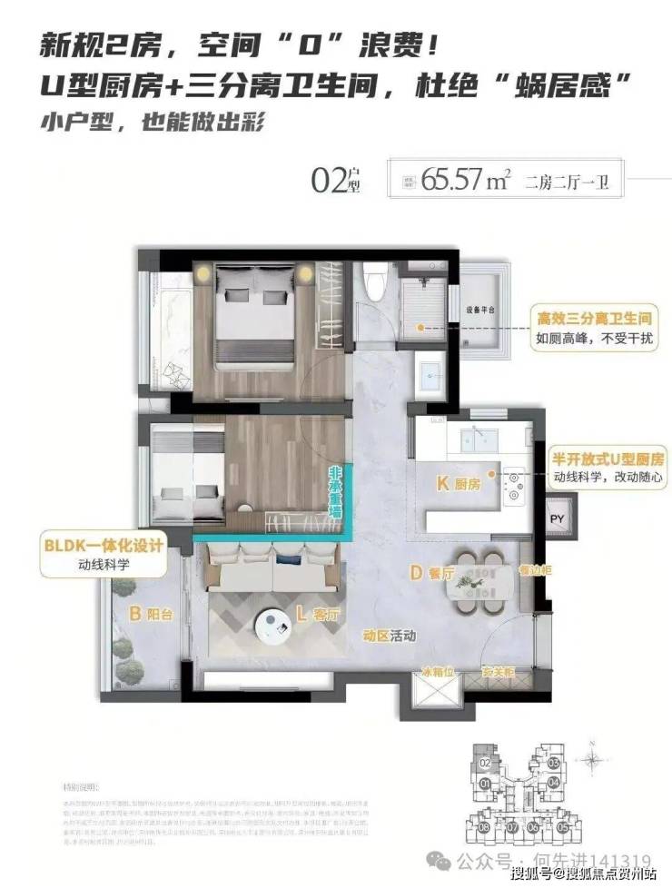 65㎡的2房2厅1卫,设计的是竖厅格局,客厅2.95米开间,LDKB一体化,S墙设计预留冰箱卡槽位,动静分区,U型厨房,卫生间三段式干湿分离还带1个设备平台,得房率约91%(包含赠送),实用面积约59.15m²,正东、正西或正南朝向。其中06.07户型少了设备平台,得房率88%,套内面积约57.2m²。