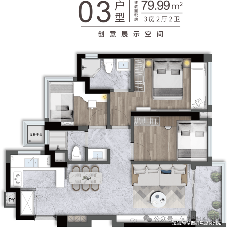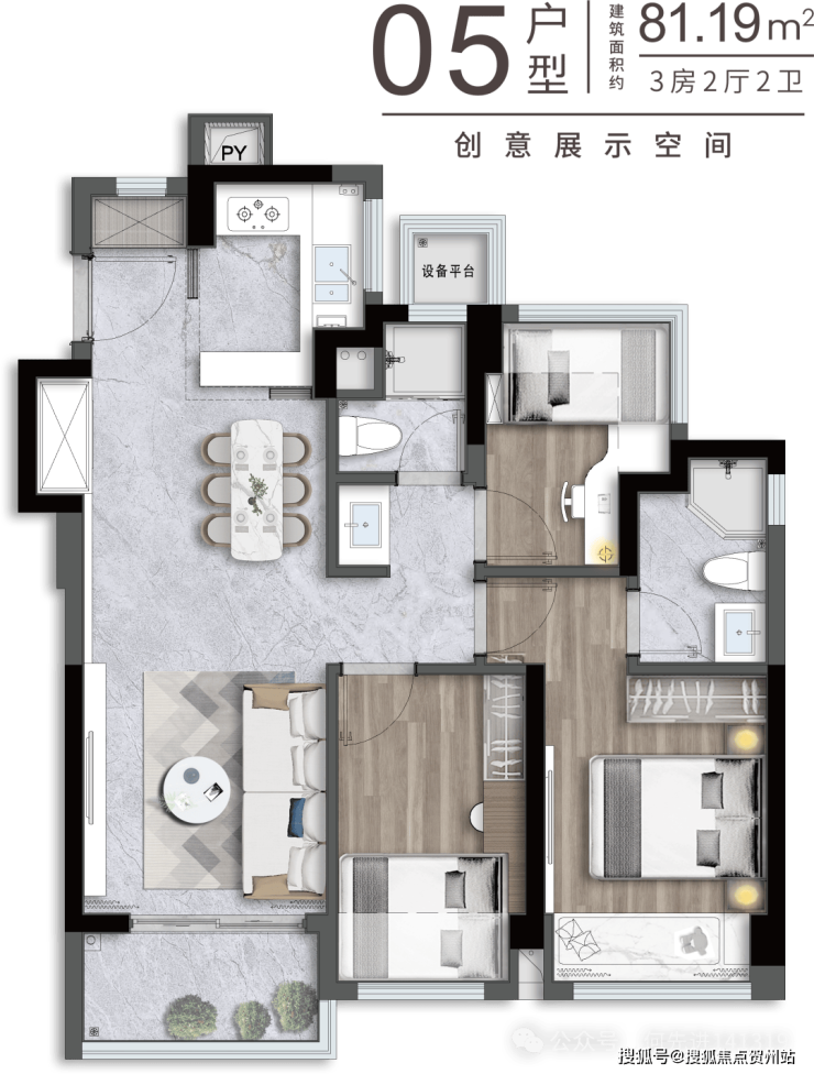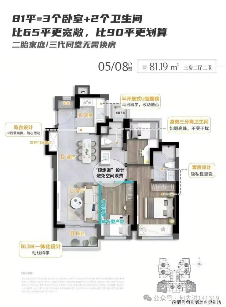 81㎡的3房2厅2卫,设计的是竖厅格局,客厅3.05米开间,LDKB一体化,S墙设计预留冰箱卡槽位,动静分区,U型厨房,卫生间三段式干湿分离还带1个设备平台,得房率约91%(包含赠送),实用面积约73.71m²,正东或正南朝向。