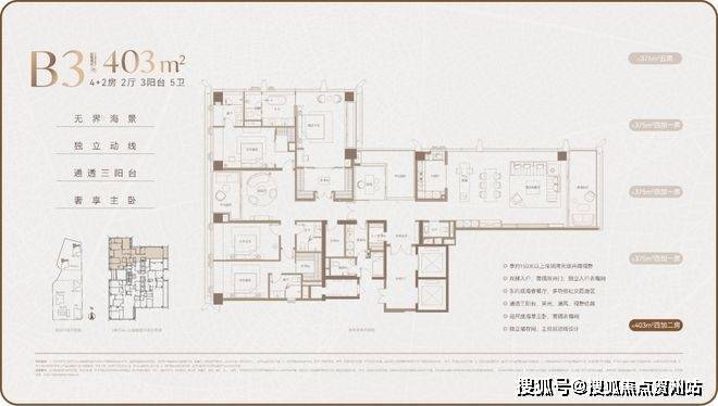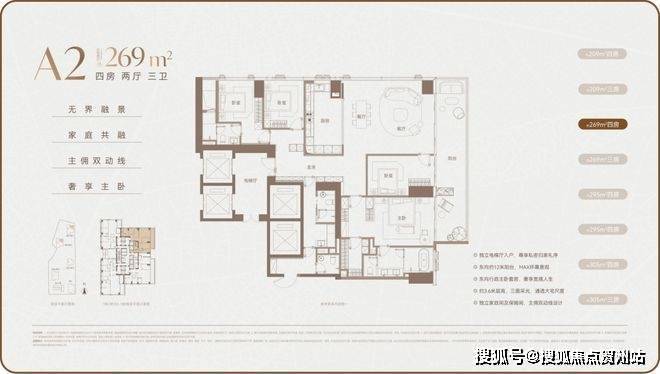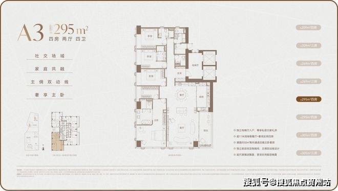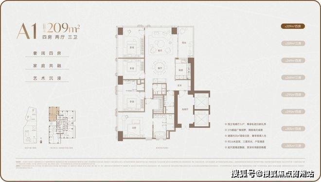 户型面积:主力户型为 209-1180㎡的大平层,涵盖 4-7 房,低区为 209-304㎡户型,高区为 370-403㎡户型,超高区为 500-700㎡户型,顶层是约 1080-1180㎡顶奢复式大平层。