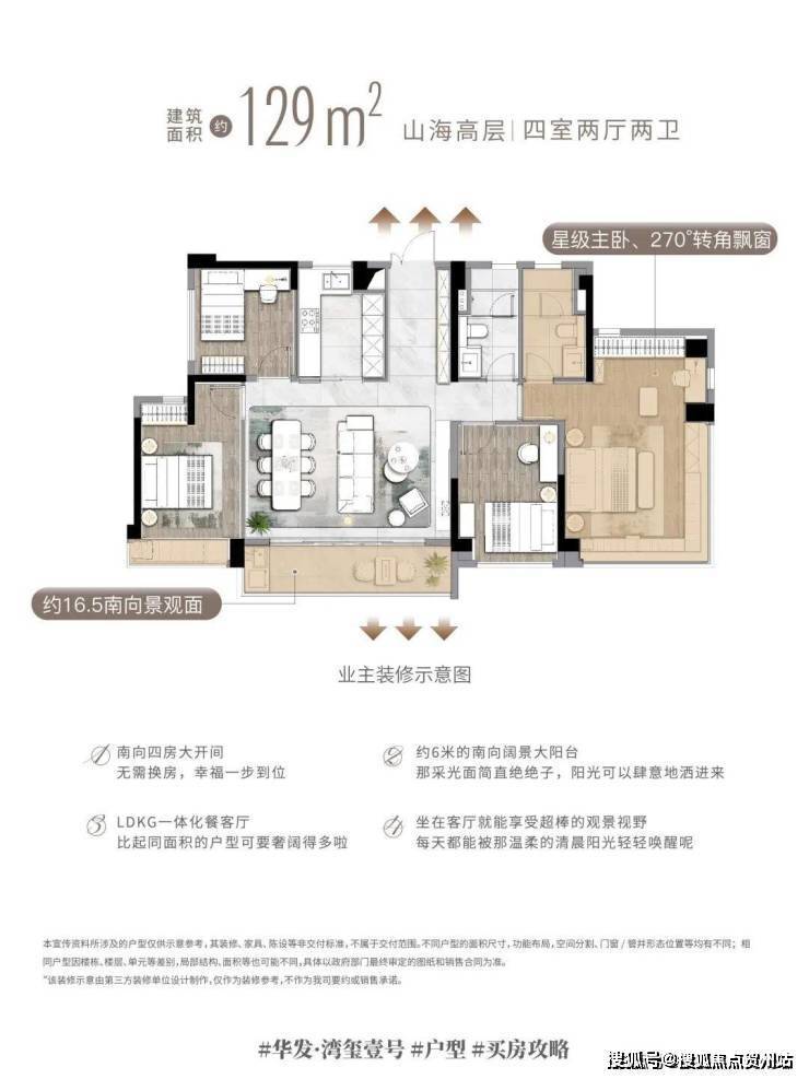 建筑面积约129㎡海景高层,以大四房的王者格局,实现改善进阶一步到位。