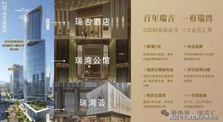 深圳华侨城.瑞湾府(别名瑞湾公馆)位于前海宝中,项目东侧及东北侧临近海滨广场,距欢乐港湾1公里,是集企业会馆、奢华酒店、精致商业于一体的垂直综合体。项目建筑高度约230米,占地面积约7700㎡,拥有建面约130-360㎡的珍藏大平层,配备高端商业瑞湾荟和百年奢华品牌瑞吉酒店。周边交通便利,配套齐全,是深圳大湾区的商务新地标。