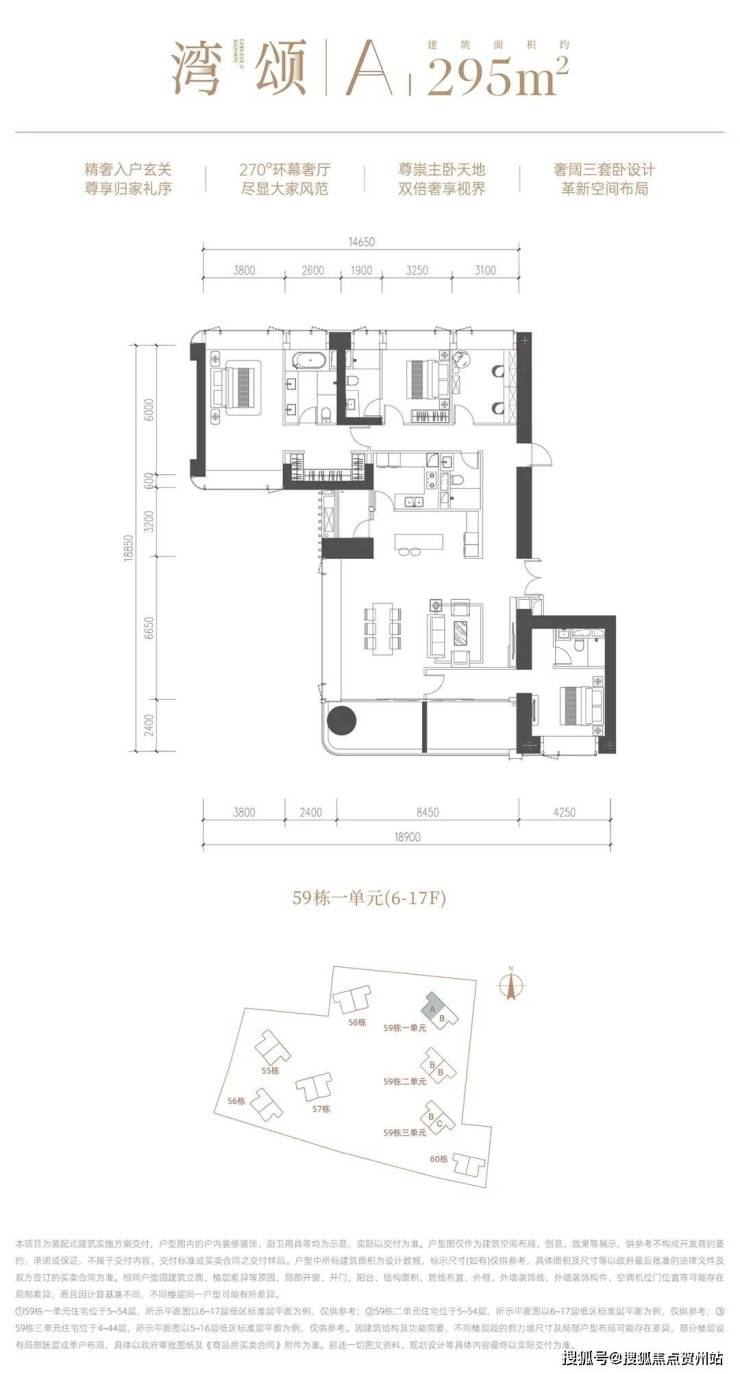 59栋1单元为3梯2户,分别是建面约255平和295平;