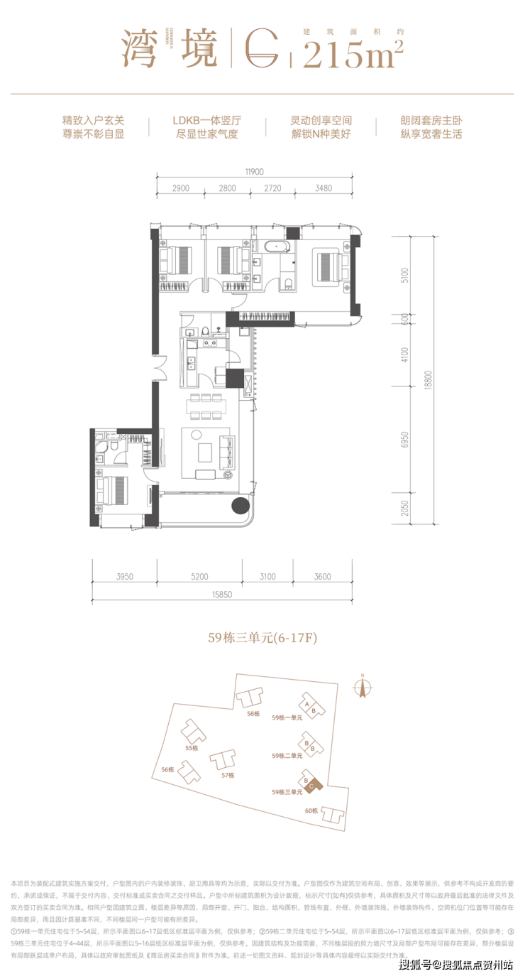 59栋3单元为3梯2户,建面约215平和255平组合。