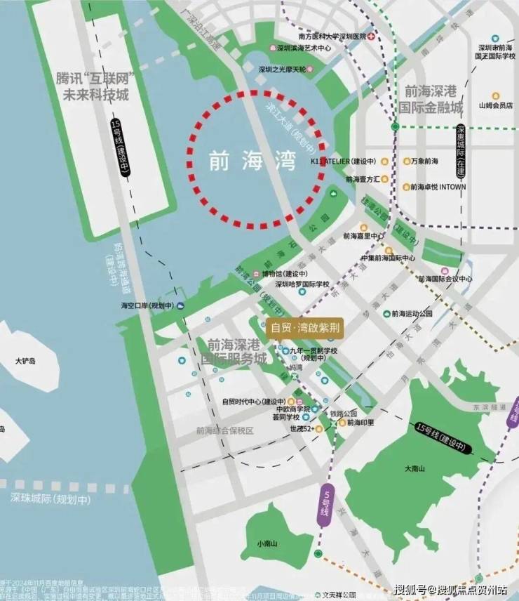 湾啟紫荆府,位于南山前海深港合作区妈湾15单元02街坊,港城路与航海路交汇处西南侧,前海划分为3个片区桂湾、前湾和妈湾,桂湾是金融区,前湾类似政务区,妈湾是比较纯粹的居住区。