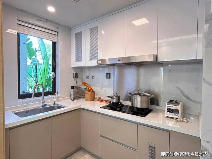 再往前走,左侧为L型厨房,预留了冰箱位,有采光窗,保证了厨房的换气和采光。