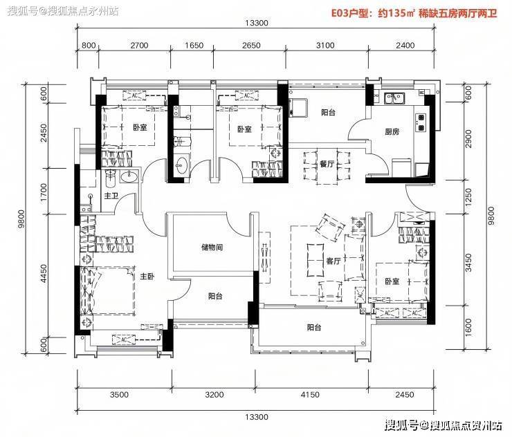 约135㎡五房两厅两卫:四开间朝南,将约2万㎡园林景观尽收眼底,双阳台与方正户型设计,让大宅生活的尊崇与舒适淋漓展现。