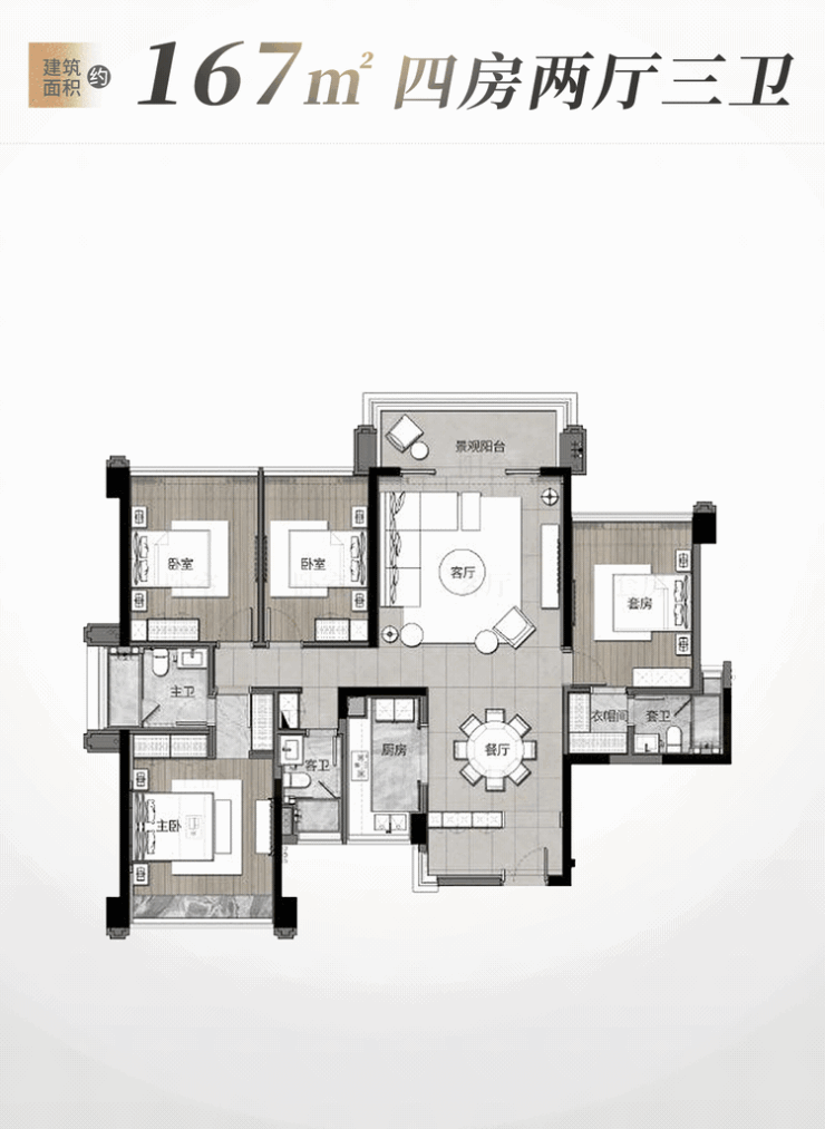 |建面约167㎡四房两厅三卫户型