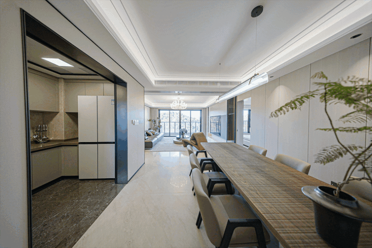 客餐厅与观景阳台一体化设计,形成开阔的公共活动区域,家庭聚会、朋友宴请...都能轻松容纳。