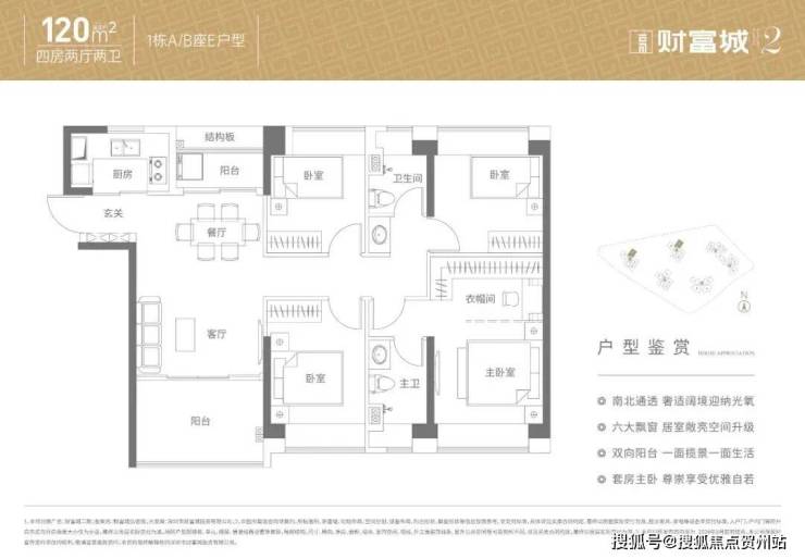 120㎡的4房2厅2卫,设计的是竖厅南北通透格局,双阳台设计,客厅实测3.5米开间,分别做到了主卧17.1㎡/次卧10.36㎡/次卧9.81㎡/次卧8.64㎡(实测面积,去掉墙体),U型厨房,得房率约:77.8%(不含赠送),阳台主朝西北向。赠送面积9.06㎡,加上赠送得房率85.29%。