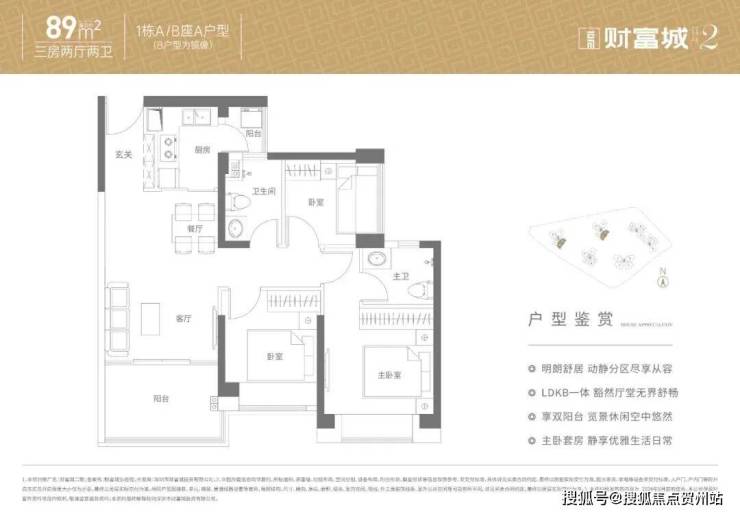 89㎡的3房2厅2卫,设计的是经典竖厅格局,客厅实测3.2米开间,LDKB一体化设计,动静分区,分别做到了主卧12.35㎡/次卧8.22㎡/次卧6.19㎡(实测面积,去掉墙体),L型厨房,卫生间干湿分离,带1个小生活阳台,得房率约:72.3-77.7%(不含赠送),西南或东南朝向。赠送面积8.3㎡,加上赠送得房率81.63-86.9%。