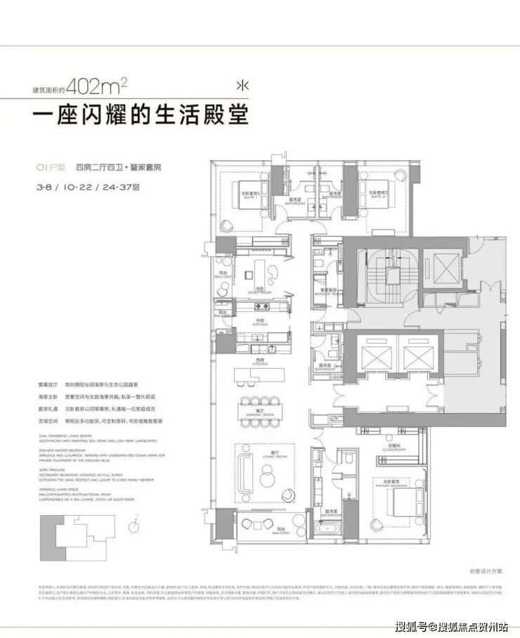 首推3栋低区户型(3-37F),高区570-1032㎡还没出样板间:实地样板间304/327/402㎡三个户型,全是"大空间+家政套间",卧室基本都是套间,所有户型都很有舒适度,整个楼栋外立面是玻璃幕墙,这样的设计采光和景观都很好。