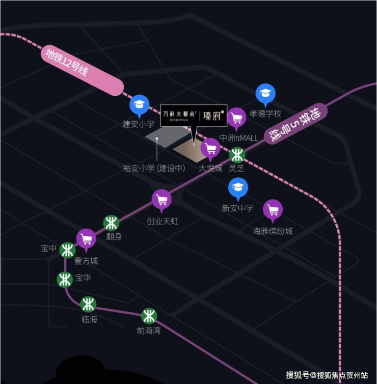 地铁5号线/12号线,交汇灵芝站,地铁2站宝中,5站前海湾站,多维一体;创业二路主干道通达,纵贯宝安黄金发展轴心