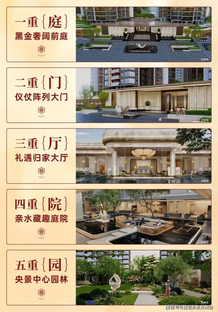 从入口开始,匠造中轴对称“玺”级五重归家礼序:循黑金奢阔前庭而入,登约68米仪仗阵列大门,穿行亲水藏趣庭院,拾级而上,央景中心园林豁然铺展。