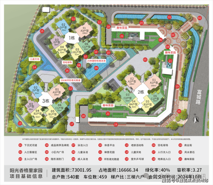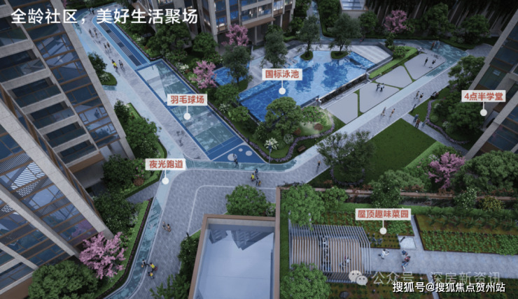 全生命周期社区,打造集亲子菜园、国际标准泳池、环形夜光跑道、共享书吧、4:30学堂、儿童天地、静心茶室等多种设施于一体,为居民提供全龄段的娱乐和健身场所 。国际标准泳池为25米长无边际泳池,为居民提供专业健身场所。环形夜光跑道长300米,沿途花木掩映,适合夜间散步和晨跑。亲子菜园约1400㎡。