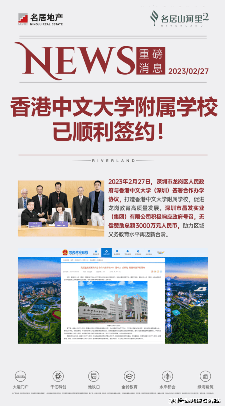 学校配套:名居山河里自带1所18班制幼儿园,家门口的香港中文大学(深圳)附属时进学校,该校是1所九年制公办学校,规划有54个教学班,也是香港中文大学(深圳)基础教育集团继大运的道远学校、知新学校之后,与龙岗区政府合作共建的第三所附属学校,在2023年的2月27日上午,香港中文大学(深圳)附属时进学校与龙岗区政府正式进行了合作办学签约仪式。
