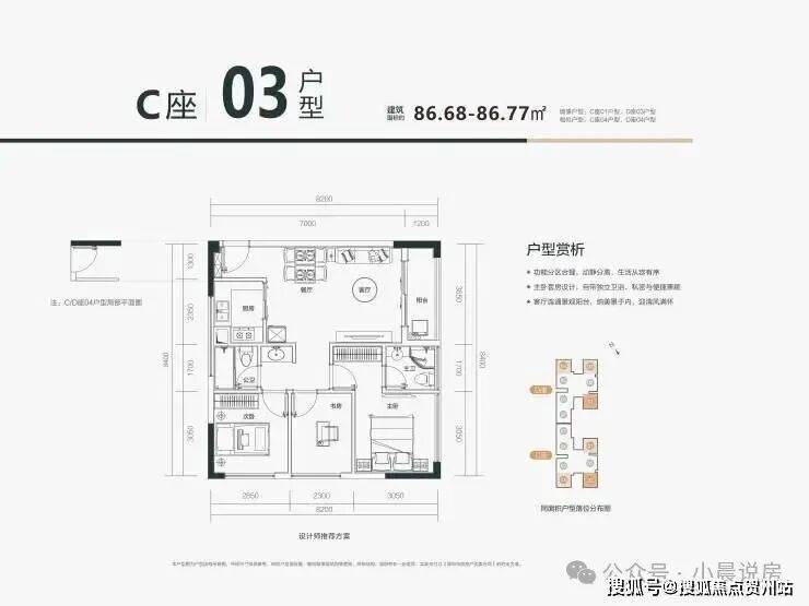 C03户型:约86㎡全能大三房,南北通透 + 全明格局
