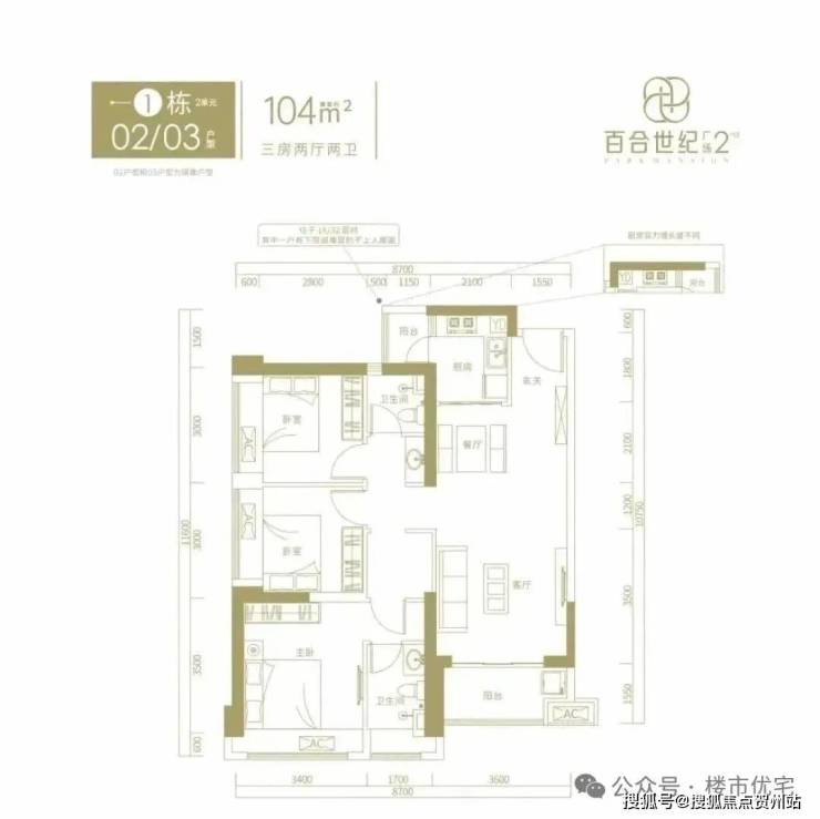 104㎡的3房2厅2卫,1栋02/03户型,设计的是竖厅格局,客厅3.6米开间,LDKB一体化设计,三开间朝南,动静分区,得房率约76%(不含赠送),正南朝向。套内面积79.04㎡+赠送10.31㎡=实得89.35㎡,加上赠送得房率约85.91%。