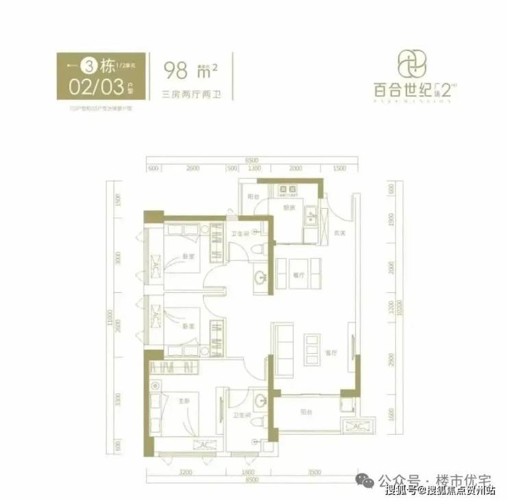 98㎡的3房2厅2卫,3栋02/03户型,设计的是竖厅格局,进门入户玄关客厅3.5米开间,LDKB一体化设计,三开间朝南,动静分区,得房率约76%(不含赠送),正南朝向。套内面积74.48㎡+赠送9.05㎡=实得83.53㎡,加上赠送得房率约85.23%。